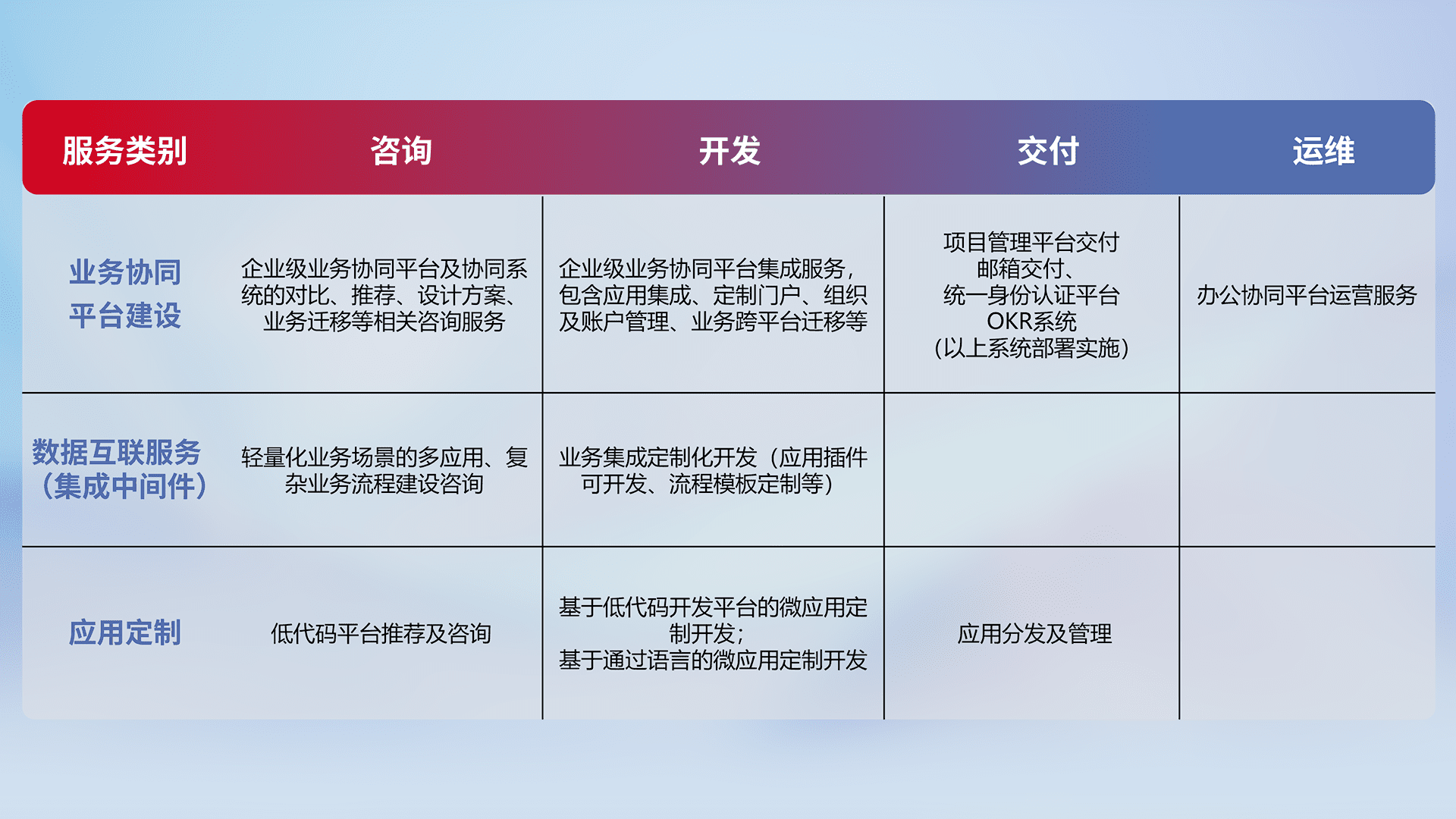 针对钉钉、、、、企微、、、、IDaas等平台级产品提供产品的规划、、、、方案、、、交付、、定制化开发等服务,,实现如统一协同办公、、、、智能客户服务、、、、混合会议管理、、智能数据查询、、、等业务场景,,,实现数字化转型。。。