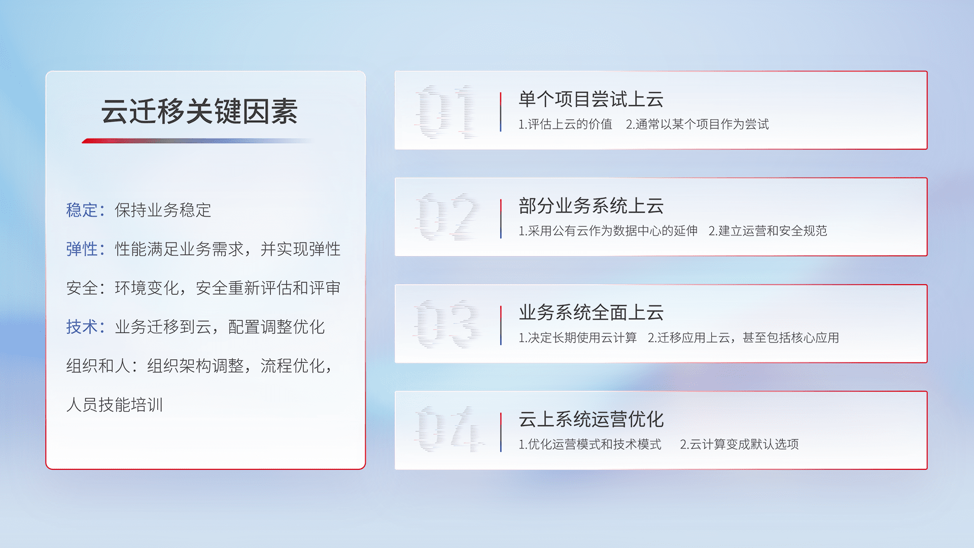 结合实际业务,,从规划设计、、、云平台选型、、、云原生改造、、、数据迁移、、、、集成交付,,,迁移全过程为客户识别最佳上云路径,,,做好风险识别管理,,,,设计网络架构、、、身份权限、、安全审计合规、、操作审计、、日志审计、、监控告警策略、、、多站点容灾设计等,,对云上基础设施进行整体规划,,,,提升IT治理水平,,,以满足弹性、、、高可用、、、高性能的需求。。。