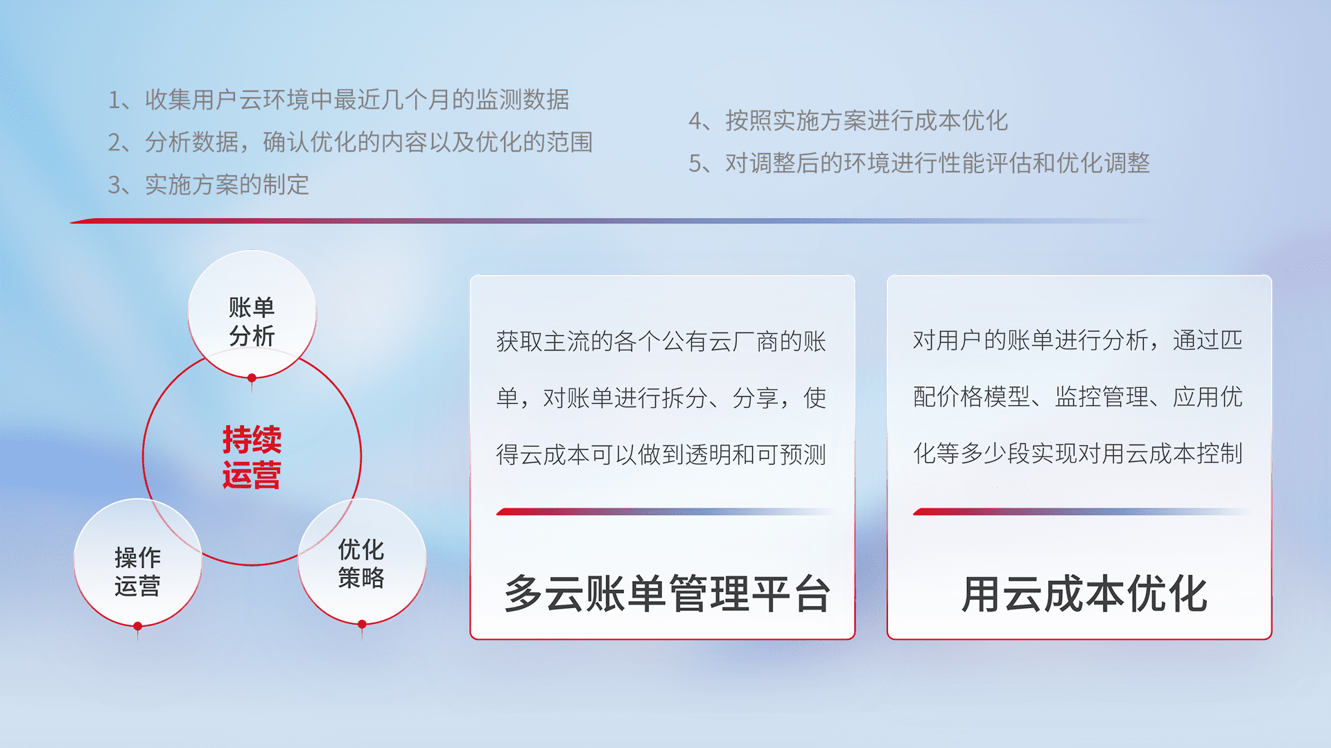通过多云纳管,,以统一的资源数据模型把客户的云资源进行抽象和封装,,进而实现对多云资源的统一操作,,,保障云资源管理的可靠性、、稳定性与可用性。。。。量身定制化运维内容,,,,配置、、、开发运维、、补丁管理、、、、备份、、监控、、、、认证和访问管理、、、审计和日常巡检等,,保障在用云过程中的可靠度,,稳定度以及高可用率。。。